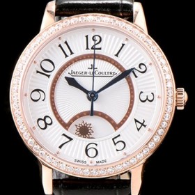 홍콩명품 [예거르꿀르뜨] 남성용 랑데부 나잇&데이 3442440 레이디 워치 18K 로즈골드 최상급 다이아몬드 세팅 베젤 문페이즈 화이트 텍스쳐드 다이얼 오토매틱 무브먼트 JAG0425