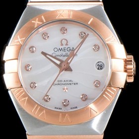 홍콩명품 [오메가] 남성용 여성 컬렉션 컨스틀레이션 123.20.27.20.55.003 오메가 코-액시얼 27MM 로마 숫자가 인그레이빙된 베젤 18K 로즈골드 콤비 화이트 자개 다이얼 쿼츠 무브먼트 OMG4110