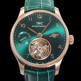 • 홍콩명품 [아이더블유씨] 남성용 신제품 UP!! 포르투기즈 컴플리케이션 하이 "투어빌론 문페이즈 파워 리저브"아시안 투어빌론 탑재 18K 로즈골드 42mm 가죽줄 그린 다이얼 iwc1599