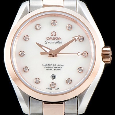 홍콩명품 [오메가] 여성용 씨마스터 "우아함의 정수" 220.20.38.20.55.001 아쿠아 테라 코-액시얼 크로노미터 화이트 자개 다이얼 18K 로즈골드 투톤콤비 오토매틱 무브먼트 OMG0100 요약정보 및 구매