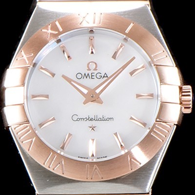 • 홍콩명품 [오메가] 남성용 여성 컬렉션 컨스틀레이션 123.20.24.60.05.001 오메가 코-액시얼 27MM 로마 숫자가 인그레이빙된 베젤 18K 로즈골드 콤비 화이트 자개 다이얼 쿼츠 무브먼트 OMG4123