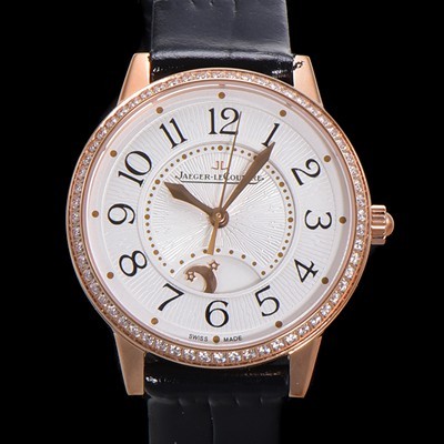 • 홍콩명품 [예거 르꿀르뜨] 여성용 랑데뷰 나잇&데이 문페이즈 오토매틱 898A 타입 무브 34mm 금장시계 보석 배젤 가죽줄 화이트다이얼 jag9251