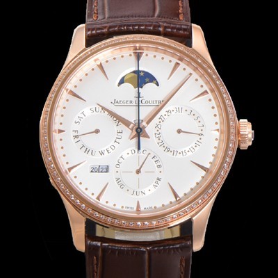 • 홍콩명품 [예거르꿀뜨르] 남성용 마스터 울트라 퍼페추얼 캘린더 18K 로즈골드 오토매틱 MC868 타입 39mm 가죽줄 다이아몬드베젤 문페이즈 화이트 다이얼 jag80287