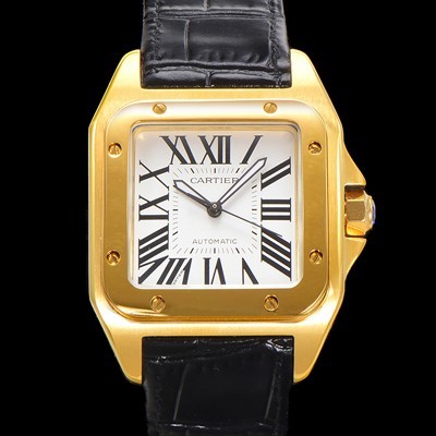 Cartier Santos 100 Automatic ETA2824-2 Type 18k Yellow Gold Men's 51mm Leather Strap White Dial