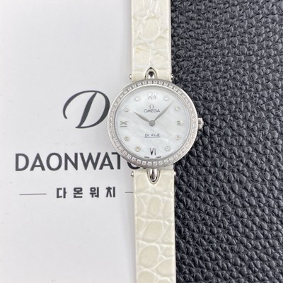 • 홍콩명품 [오메가] 여성용 드빌 424.18.27.60.52.001 프레스티지 듀드롭 27.4mm 다이아몬드 쿼츠 무브먼트 화이트 자개 다이얼 omg0238