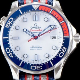 블루, 레드 & 그레이 컬러의 5줄 스트라이프 폴리아미드 NATO 스트랩에는,별도로 제공되는 화이트 실버 골드 브레이슬릿은 007 문구가 인그레이빙된 폴딩 클래스프가 포함되어 있습니다. 본 제품은 오메가 칼리버 2507로 구동됩니다.