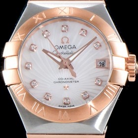 홍콩명품 [오메가] 남성용 여성 컬렉션 컨스틀레이션 123.20.27.20.55.001 오메가 코-액시얼 27MM 로마 숫자가 인그레이빙된 베젤 18K 로즈골드 콤비 화이트 자개 다이얼 쿼츠 무브먼트 OMG4121