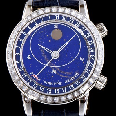 블루 다이얼의 상반부에 위치한 상징적인 타원형의 모습은 파텍필립 본사가 있는 스위스 제네바에서 바라본 밤하늘의 모습을 담아내고 있다