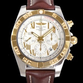 홍콩명품 [브라이틀링] 남성용 원드라이더 크로노맷 오토매틱 ETA-7750 기계식 44mm 18K 옐루골드 가죽줄 화이트다이얼 bre9152