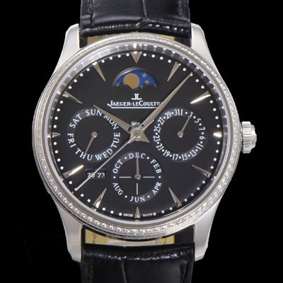 • 홍콩명품 [예거르꿀뜨르] 남성용 마스터 울트라 퍼페추얼 캘린더 오토매틱 MC868 타입 39mm 가죽줄 다이아몬드베젤 문페이즈  블랙다이얼 jag49774