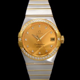 Omega Men's Constellation 18k yellow gold diamond set bezel 38mm automatic 8500 type Champagne dial